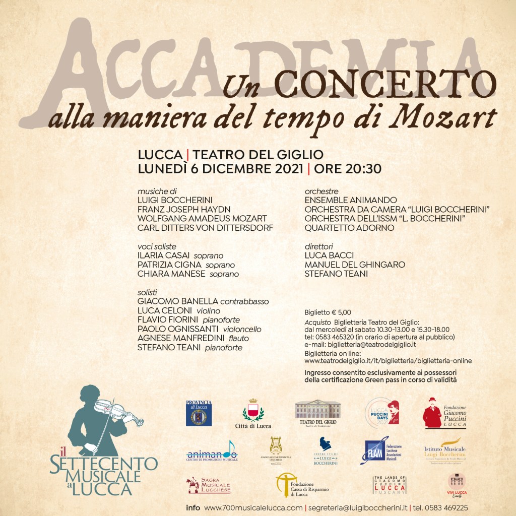 Il concerto “Accademia” ripropone in chiave moderna il modello di programmazione concertistica tipico delle stagioni pubbliche settecentesche. Si propone un programma articolato secondo le modalità dell’epoca, profondamente diverse da quelle del concerto sinfonico moderno, è dunque una straordinaria occasione per entratre in contatto con il secolo d’oro della Lucca musicale. Conformemente alle usanze dell’epoca questa “ Accademia” prevede i quattro movimenti di una Sinfonia di Luigi Boccherini distribuiti in momenti diversi della serata e inframezzati da brani di diverso genere e di altri autori in una coinvolgente alternanza di musica vocale, musica da camera e concerti solistici.