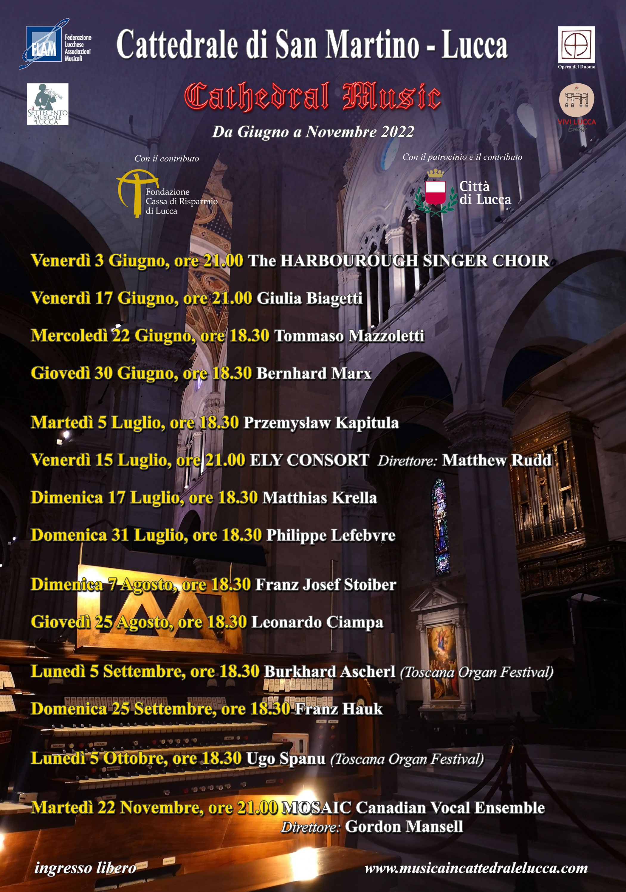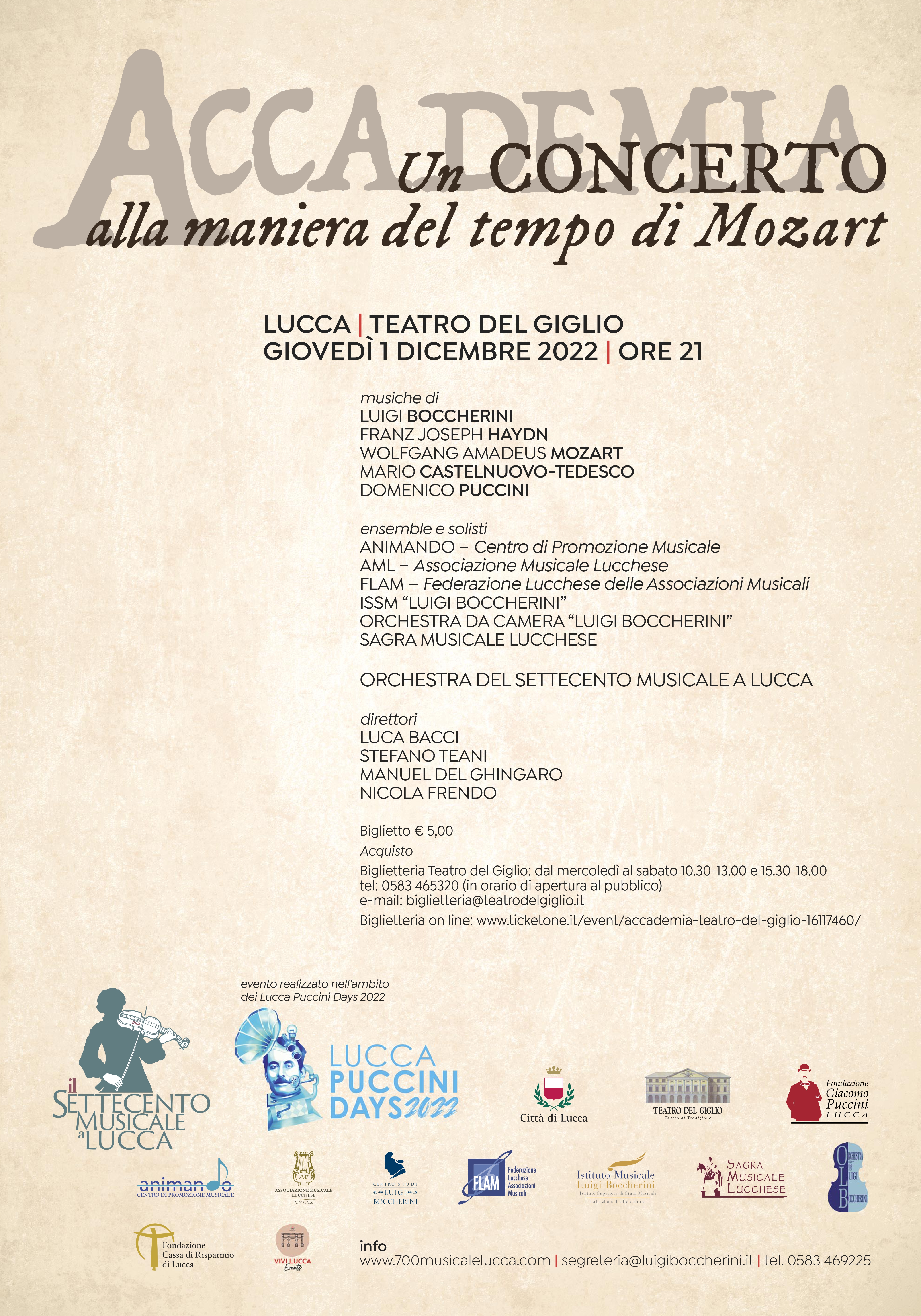 9 gennaio Lucca | Chiesa dei Servi | ore 17.30 Concerto dell’Epifania. Musiche di Čajkovskij, Grieg Giacomo Nesi, violino Nicola Fanucchi, voce Orchestra Nuove Assonanze | Svilen Simeonov, direttore Animando – Centro di promozione musicale 23 gennaio Lucca | Auditorium del Suffragio | ore 17 Musiche di Vivaldi, Richter Anna Tifu, violino Orchestra dell’Istituto Superiore di Studi musicali "L. Boccherini" GianPaolo Mazzoli, direttore Associazione musicale lucchese | Stagione cameristica 12 febbraio Lucca | Auditorium del Suffragio | ore 17 Musiche di Bach, Busoni, Franck, Chopin, Liszt/Jean Guillou Alessandro Marangoni, pianoforte Paolo Oreni, organo (Organo Wanderer) Associazione musicale lucchese | Stagione cameristica 19 febbraio Lucca | ISSM “Luigi Boccherini”, Saletta Rossa | ore 15 Tavola rotonda in memoria di Remigio Coli Centro studi Luigi Boccherini – ISSM “Luigi Boccherini” – Associazione musicale lucchese Lucca | Auditorium del Suffragio | ore 17 Musiche di Luigi Boccherini Giovanni Gnocchi, violoncello Orchestra dell’Istituto Superiore di Studi musicali "L. Boccherini" GianPaolo Mazzoli, direttore Associazione musicale lucchese | Stagione cameristica 1 aprile Lucca | Chiesa dei Servi | ore 21 Concerto dei Maestri lucchesi Francesco Xaverio Geminiani | Concerto Grosso n.2 op.3 Luigi Boccherini | Concerto per violoncello e archi n.6 G479 Stefano Teani | prima assoluta di un brano per archi Rachele Nucci, violoncello Ensemble Animando | Coordinatore: Gianmaria Griglio Animando – Centro di promozione musicale 8 aprile Lucca | Chiesa dei Servi | ore 21 Concerto per violoncello e orchestra Luigi Boccherini | Sinfonia op.21 n.4 in re maggiore G496 Franz Joseph Haydn | Concerto per violoncello e orchestra n.2 in re maggiore W.A. Mozart | Sinfonia n.29 in la maggiore Balázs Dolfin, violoncello (vincitore del concorso Virtuoso & Belcanto 2021) Orchestra Filarmonica di Firenze (La Filharmonie) Giulio Arnofi, direttore Animando – Centro di promozione musicale 15 aprile Lucca | Chiesa di Santa Maria Forisportam (Santa Maria Bianca) | ore 16 Musica per la sacra rappresentazione del Venerdì Santo Giovan Battista Pergolesi | Stabat Mater Ilaria Casai | soprano Magdalena Ubranowic | mezzosoprano Animando – Centro di promozione musicale Libretto di sala 23 aprile – 1° maggio Lucca Classica Music Festival In programma numerosi eventi dedicati alla musica del Settecento lucchese con omaggi a Boccherini e alla tradizione musicale del XVIII secolo, insieme ai più grandi protagonisti del panorama internazionale. 24 aprile Lucca | Chiesa Dei Servi | ore 17.30 Da Mozart a Wolf-Ferrari: la Musica, la Grazia, il Silenzio Musiche di Mozart, Wolf-Ferrari, Catalani Wolfgang Amadeus Mozart | Ouverture da Le nozze di Figaro Ermanno Wolf-Ferrari | Concerto in re maggiore per violino e orchestra op. 26 Laura Marzadori, violino Ermanno Wolf-Ferrari | Concerto in do maggiore per violoncello e orchestra op. 31 «Invocazione» Erica Piccotti, violoncello Alfredo Catalani | Ero e Leandro (poema sinfonico) Orchestra Nuove Assonanze Alan Freiles Magnatta, direttore Animando – Centro di promozione musicale Locandina 30 aprile Lucca | Palazzo Ducale - Cortile degli Svizzeri | ore 16:30 Boccherini in città | manifestazione di chiusura di Io e Luigi veri amici, un progetto didattico del Centro studi Luigi Boccherini a cura di Carla Nolledi Musiche di Boccherini e altri Centro studi Luigi Boccherini 7 maggio Lucca | Sala Ademollo - Palazzo Ducale | ore 18 Perle Toscane Musiche di Mascagni, Catalani, G. Puccini e Toselli Maria Luigia Borsi, soprano Antonio Artese, pianoforte Sagra Musicale Lucchese 14 maggio Duomo di Castelnuovo di Garfagnana (Lucca) | ore 21 Concerto d'organo Musiche di Luis Vierne Niccoloò Bartolini, organo Sagra Musicale Lucchese 21 maggio Lucca |Auditorium del Suffragio | ore 21 Concerto Musiche di W.A. Mozart, L. Boccherini, F.J. Haydn Enrico Bronzi, violoncello Nima Keshavarzi, direttore Orchestra La Filharmonie Centro studi Luigi Boccherini, Associazione La Filharmonie e ISSM “L. Boccherini” 28 maggio Omaggio a Luigi Boccherini. Commemorazione nell’anniversario della morte Ore 12.30 | Lucca | Albergo San Martino A Casa di Boccherini. Intervento musicale a cura del Liceo Artistico Musicale «Augusto Passaglia» Ore 16.30 | Lucca | Chiesa di San Franceschetto Commemorazione. Intervento musicale a cura degli studenti dell’ISSM “L. Boccherini” Ore 21.00 | Lucca | Auditorium del Suffragio Concerto Centro studi Luigi Boccherini e ISSM “L. Boccherini” 29 maggio Lucca | Chiesa di Santa Maria Corteorlandini | ore 18 Musiche di Luigi Boccherini Solisti Orchestra da Camera "Luigi Boccherini" Luca Celoni, primo violino - Enrico Bernini, secondo violino - Angela Landi, viola - Paolo Ognissanti, primo violoncello - Carlo Benvenuti, secondo violoncello Patrizia Cigna, soprano Sagra Musicale Lucchese 30 maggio Lucca | Teatro del Giglio | ore 21 Concerto dell'Orchestra della Toscana (ORT) Giacomo Puccini | Crisantemi Luigi Boccherini | Concerto per violoncello e orchestra n. 9 in si bemolle G 482 (versione originale) Laura van der Heijden, solista Luigi Cherubini | Sinfonia in re maggiore Orchestra della Toscana Beatrice Venezi, direttore Animando – Centro di promozione musicale 3 giugno Lucca | Cattedrale di San Martino | ore 21 Concerto Corale Strumentale The Harborough Singer Choir FLAM | Musica in Cattedrale 4 giugno Lucca | Chiesa nuova di San Vito | ore 21 Gruppo vocale "Stereo-Tipi" Musica gregoriana e musiche di G.P. da Palestrina, L. Perosi, Gjello, Nanino, Deraco e altri Soprani: Silvia Ceccarelli, Serena Salotti, Felicity Lucchesi, Lia Salotti Alti: Marina Del Fava, Clara Ceccarelli, Elisa Squicciarini Tenori: Lorenzo Giovannelli, Pietro Battiston, Marco Musto Bassi: Andrea Salvoni, Matteo Fracchi, Morando Bertoncini Organista: Maurizio Pierini Sagra Musicale Lucchese 11 giugno Lucca | Cattedrale di San Martino | ore 21 Musiche sacre e repertorio per 